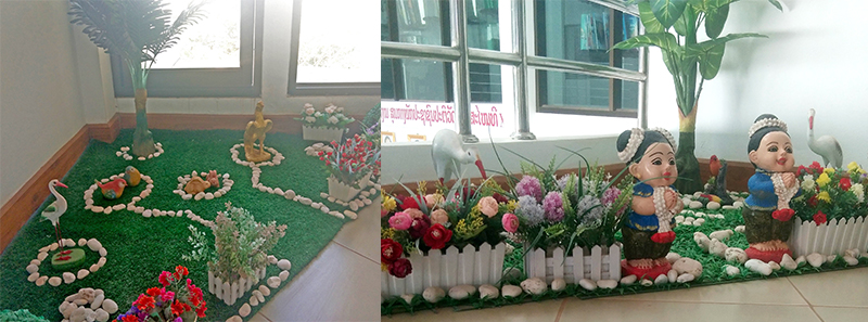 樓梯拐角處布置有陳設(shè)點,用一些白色石頭拼湊圖案,輔以盆栽、鮮花、小人等裝飾,濃厚的學(xué)習(xí)氛圍中透出一絲活潑。