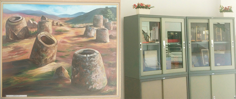 二樓樓梯拐角處掛著老撾古老寺廟油畫,旁邊的柜子里整齊擺放著幾排各國國旗;三樓樓梯拐角處掛的則是川壙省石缸平原油畫,旁邊的柜子里放置著一些老撾紀(jì)念品。