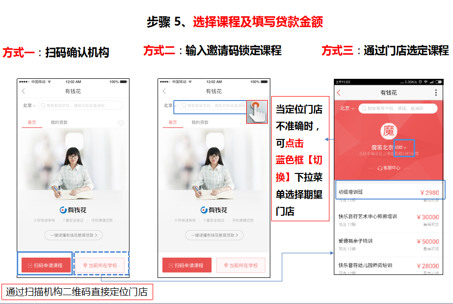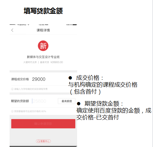 方式三:通過門店選定課程,填寫貸款金額【成交價格:與機構(gòu)確定的課程成交價格(包含首付);期望貸款金額:確定使用百度貸款的金額,成交價格-已交首付】