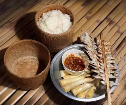 糯米飯是老撾人最?lèi)?ài)吃的主食,約占全部食物的70%。老撾糯米飯的做法是:頭天晚上用水浸泡糯米,第二天清晨把米撈在一個(gè)竹編漏斗狀有蓋的容器內(nèi),將其套架在盛水的陶缽口上,燒蒸。這種糯米蒸飯粘性好,軟硬適中,香甜可口。吃飯時(shí),將煮熟的糯米飯盛在一種叫做“迪普考”的竹編小飯簍里。吃時(shí),把飯簍的蓋子打開(kāi),抓出一小團(tuán)糯米飯,用手使勁攥、捏,然后蘸著用魚(yú)露、辣椒等制作的調(diào)料吃。據(jù)說(shuō),飯團(tuán)捏得越緊,吃起來(lái)越香。