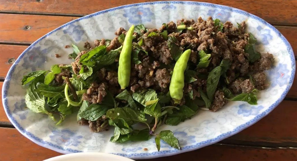 老撾語(yǔ)叫Lahp,老撾最著名的代表菜之一,其做法是將新鮮的雞肉、豬肉、牛肉或魚(yú)肉剁碎,拌以魚(yú)露、辣椒、鹽、青檸、香茅、薄荷等多種佐料制成,味道鮮美獨(dú)特。這個(gè)特色菜分生、半熟和全熟,點(diǎn)的時(shí)候一定要說(shuō)清楚,否則對(duì)于吃慣了熟食的人來(lái)說(shuō)很難下咽。