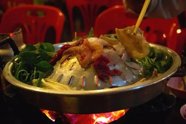 老式火鍋為涮烤兩吃,跟中式火鍋還是有很大區(qū)別的?;疱伒男螤罡褚粋€(gè)有沿兒的平底鍋,中間高高鼓起,可用于燒烤,周?chē)糜阡讨?,還有大廚現(xiàn)場(chǎng)烤制的大蝦、生蠔、牛肉串等食物,配上一瓶老撾啤酒,盡享美食。