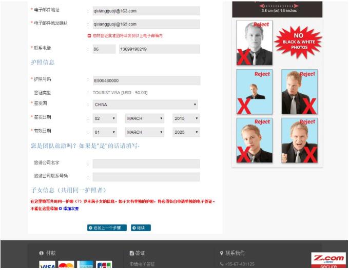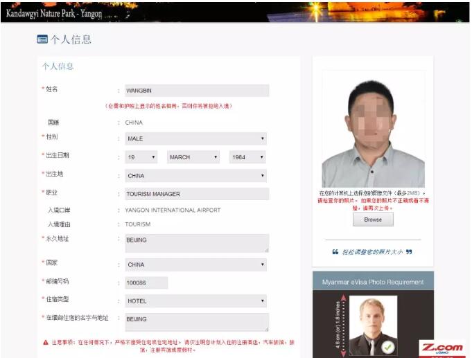 這是頁面的上半部分;比較簡單;名字;國籍;性別,出生日期;出生地,職業(yè),這些都按照護(hù)照的信息填寫;常駐家庭地址;國家;郵編;在緬甸的入住酒店的類型;酒店,公寓,快捷酒店;之類的選擇;酒店的名稱;還沒有預(yù)定的話,就可以上網(wǎng)預(yù)定一個可以取消的那種;很多網(wǎng)站都可以在一定時間內(nèi)取消酒店;預(yù)定一個,這些酒店信息就都有了;注意,照片不能大于2M哦;