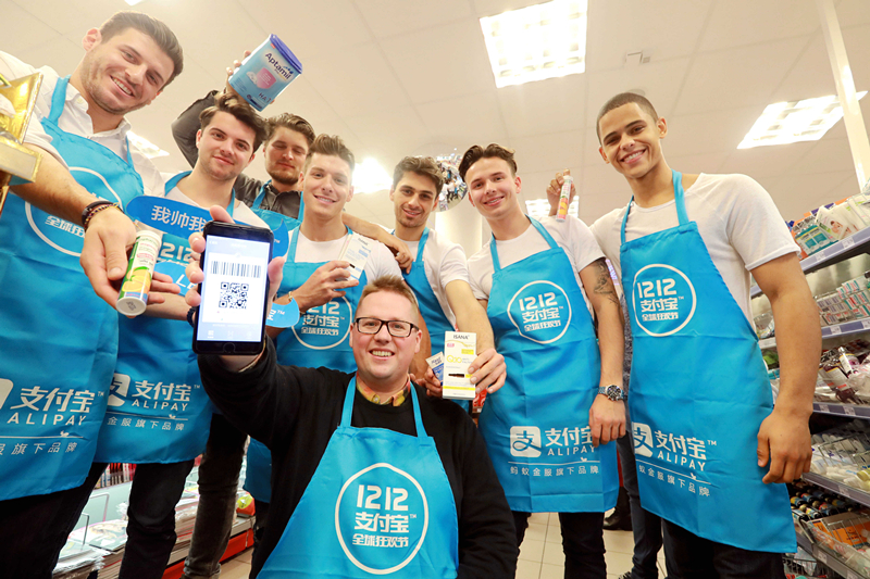 當?shù)貢r間12月11日,德國“網紅”阿福(前排中)在法蘭克福市中心一家Rossmann日化連鎖為“雙12”促銷活動助陣。受到中國國內民眾歡迎的“雙12”購物狂歡今年由支付寶引入德國。