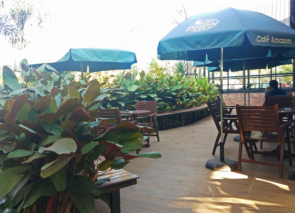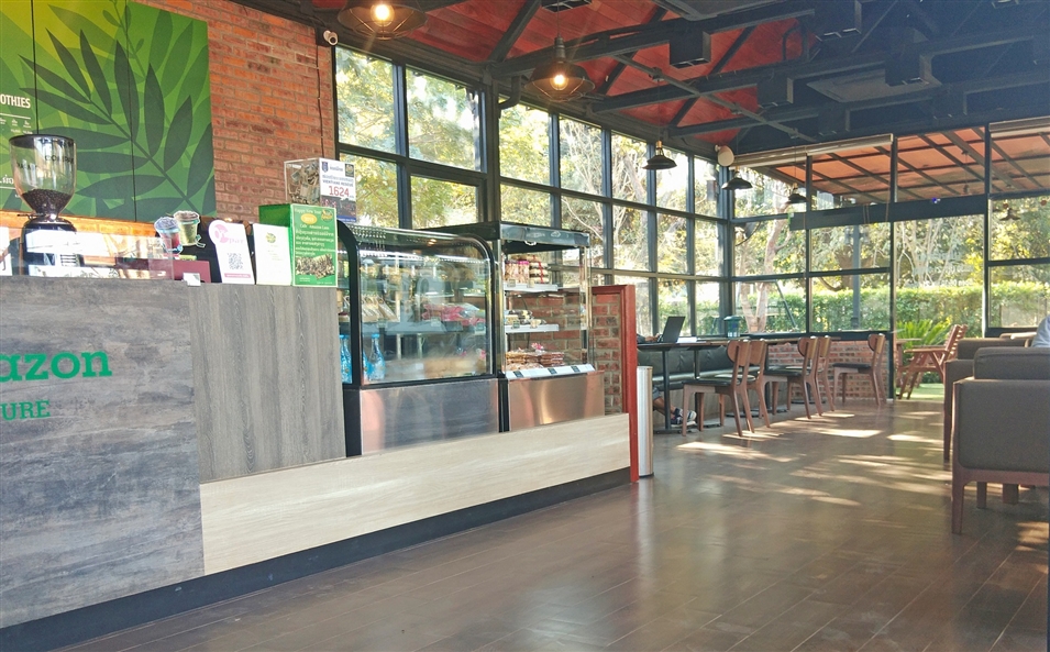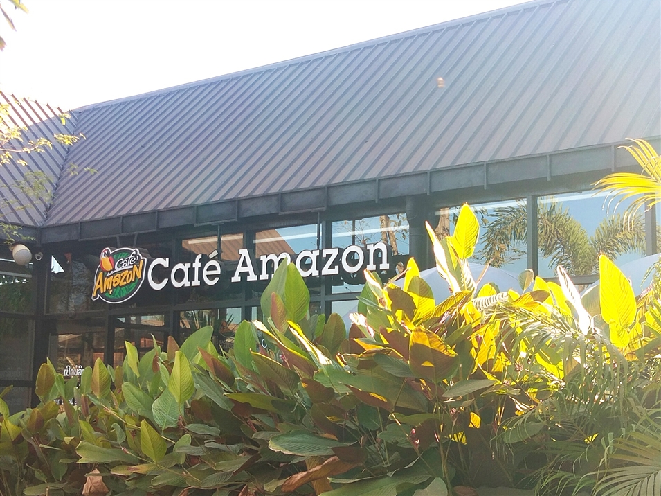 亞馬遜咖啡館的紅磚外墻與干凈明亮的落地窗相映,充滿休閑氣息。室內(nèi)寬敞整潔,歸本主義的原木桌椅,適合打發(fā)午后的閑暇時光。