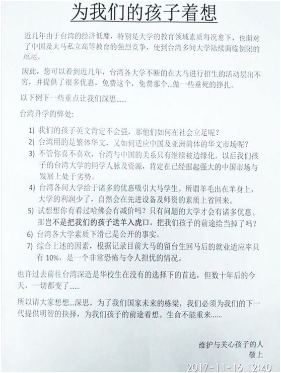 公開信同時列舉臺灣升學(xué)七大弊端,其中第二點是,“臺灣用的是繁體華文,又如何適應(yīng)中國及亞洲簡體的華文市場呢?”第三點是“不管你喜不喜歡,臺灣與中國的關(guān)系只有繼續(xù)被邊緣化。以后我們孩子的臺灣大學(xué)的同學(xué)人脈及資源,肯定在已經(jīng)崛起強大的中國市場與發(fā)展上處于劣勢”。第七點提出臺灣升學(xué)弊端的結(jié)論是,“大馬留臺學(xué)生回到馬來西亞后,就業(yè)率只有10%,是一個非??植琅c令人擔(dān)憂的情況”。